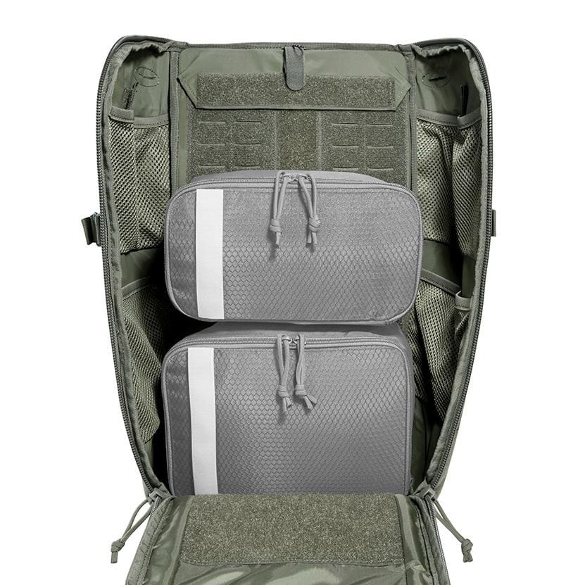 The ergonomically padded back panel integrates aluminum support elements for enhanced load transfer and rigidity. A detachable rear panel with a shapeable aluminum rail allows users to customize the pack’s structure to mission-specific requirements. Length-adjustable shoulder straps and padded hip fins with zippered pockets, removable via hook-and-loop attachment, further enhance adaptability and load management.
